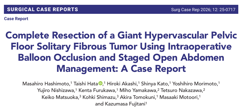 タイトルは、「Complete Resection of a Giant Hypervascular Pelvic Floor Solitary Fibrous Tumor Using Intraoperative Balloon Occlusion and Staged Open Abdomen Management: A Case Report」がSurgical Case Reportsに掲載されました。